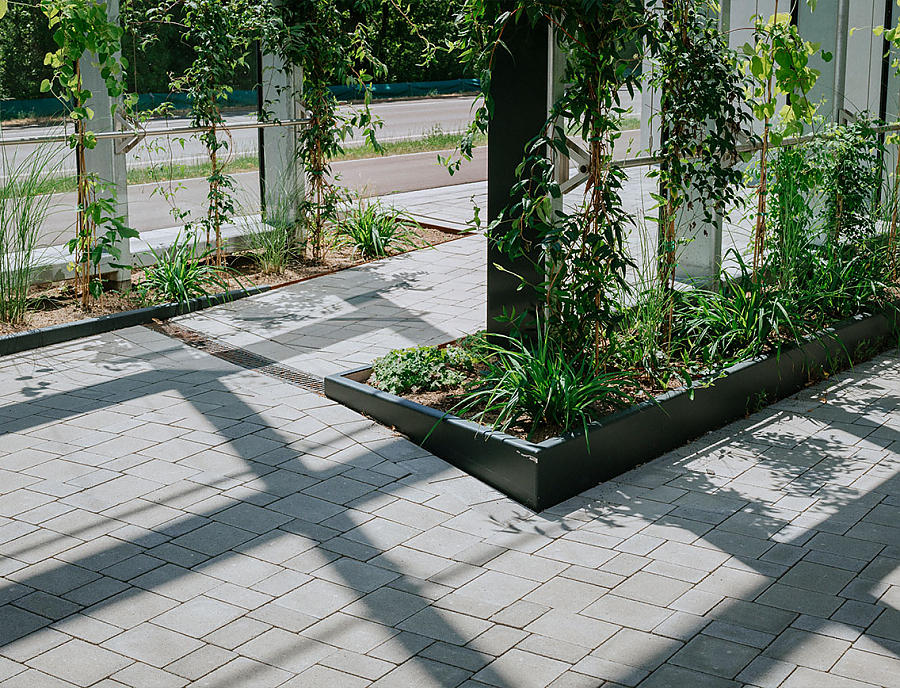 Haushohe Glasflächen schirmen den Straßenlärm ab, lassen Licht ins Innere und bieten Kletterpflanzen ideale Bedingungen. Mit den Jahren wird hier eine drei Stockwerke hohe, begrünte Wand entstehen – ein weiteres Beispiel dafür, wie sich Architektur, Freiraumgestaltung und Pflasterlösungen zu einem lebendigen, grünen Ganzen verbinden.